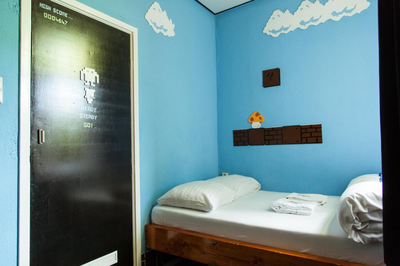 Double Bed in 12-Person Mixed Dormitory Room. This dormitory room has shared bathroom facilities. It features 8 single bunk beds for 8 guests and 2 queen size bunk beds for 4 guests. ;